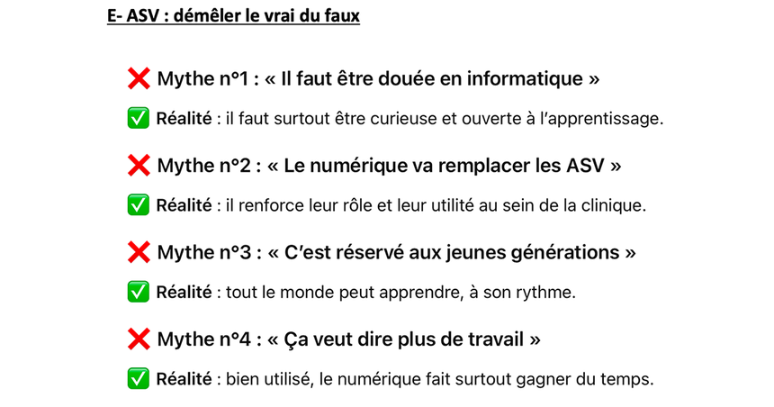 Rassurez-vous : devenir E-ASV ne veut pas dire tout maîtriser du jour au lendemain (ouf !). Il ne s’agit pas de révolutionner la clinique en une semaine, mais d’avancer pas à pas. Un nouvel outil, une nouvelle habitude, un petit test… et déjà, on progresse. L’erreur fait partie du jeu, et personne ne devient expert sans tâtonner un peu.