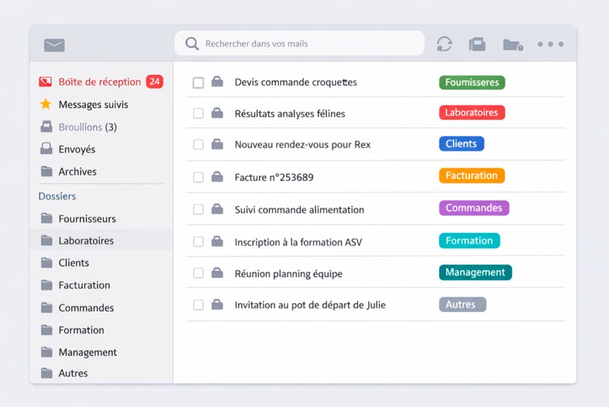 Quelques dossiers bien choisis peuvent changer complètement la vie dans une boîte mail. Fournisseurs, laboratoires, clients, facturation, commandes… pas besoin d’en créer 50, mais mieux vaut que ceux-ci soient clairs et connus de toute l’équipe.