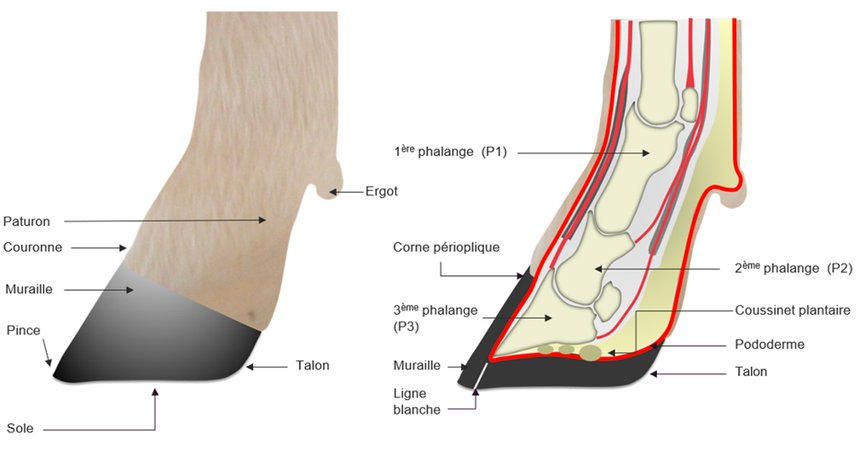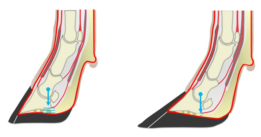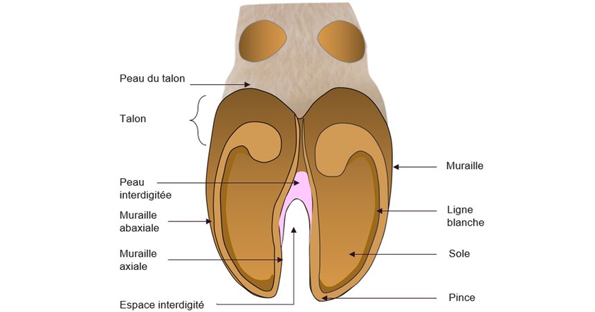 Les conditions d'élevage favorisent souvent une usure insuffisante de la corne, ce qui peut entraîner des modifications de la conformation du pied. La partie antérieure et abaxiale, qui pousse plus vite, sera souvent moins usée car très dure ; la corne axiale de la sole, elle, pousse moins vite et s’use plus rapidement car celle-ci est moins dure.