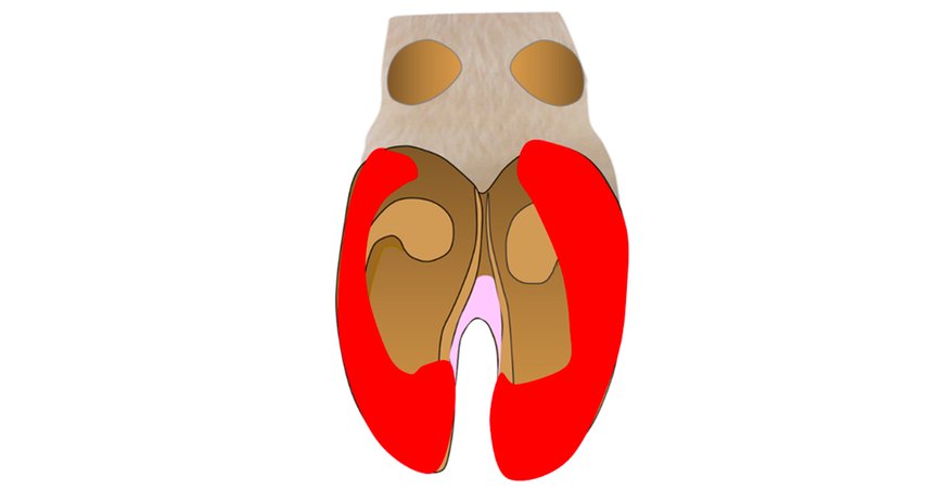 À l’intérieur de la boite cornée, cela conduit à un « basculement » de la 3ème phalange qui penche vers l’arrière et la région axiale : la force exercée par la partie caudale de la 3ème phalange (et notamment sa protubérance axiale et solaire) est répartie sur une zone plus faible, ce qui augmente la pression exercée sur le pododerme et va conduire au développement d’une lésion, « l’ulcère typique de la sole » qui se retrouve en zone axiale, à la jonction entre la corne de la sole et celle du talon (voir la figure ci-dessous).
