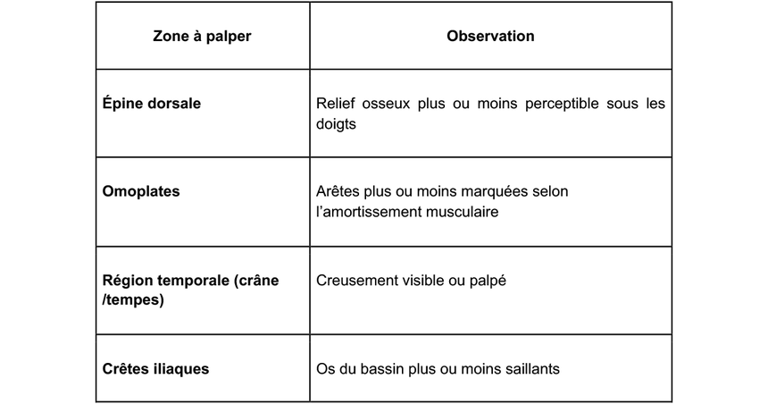 L’évaluation repose sur la palpation de zones où la musculature est bien identifiable [2] :