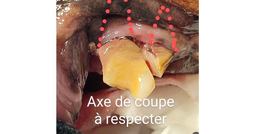 L’axe de coupe est mésio-distal, jusqu’à la furcation dentaire principale située entre la racine caudale et les deux racines crâniales (voir photo 2).