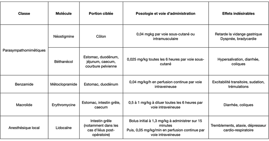La lidocaïne, un anesthésique local régulièrement utilisée comme prokinétique chez le cheval, n’a quant à elle pas d’effet démontré (Burke et Blikslager, 2018 ; Lisowski et al., 2018). La lidocaïne a cependant une action anti-inflammatoire et analgésique, et reste intéressante dans la prise en charge de l’iléus post-opératoire (Freeman, 2019 ; Lefebvre et al., 2016) . Les effets indésirables de la lidocaïne sont les tremblements, l’ataxie, la dépression cardio-respiratoire, notamment lorsque celle-ci est administrée trop rapidement ou à une dose trop élevée.